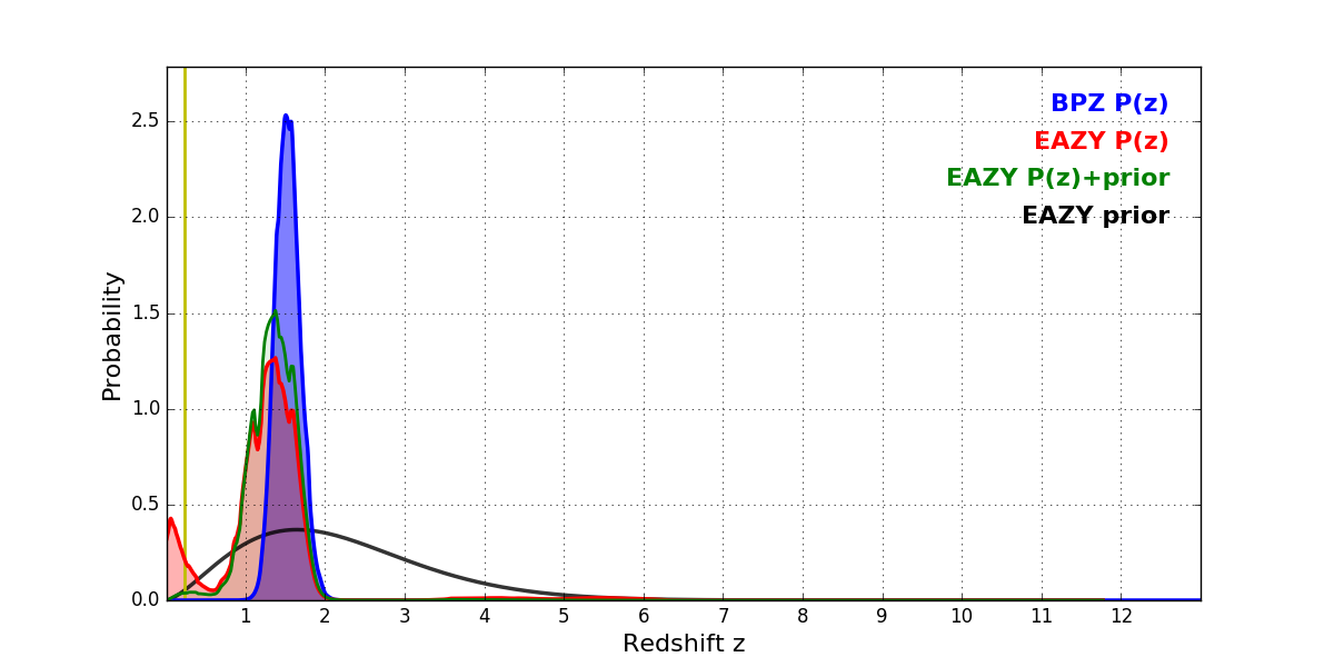 In P(z) plots: Yellow lines mark the cluster redshift z = 0.228,