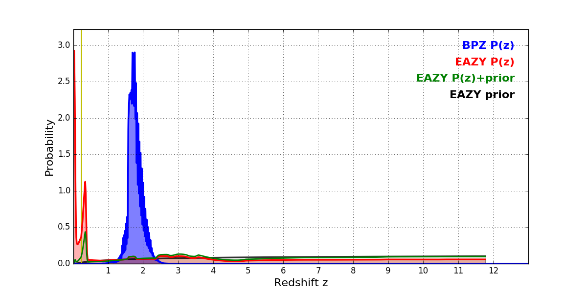 In P(z) plots: Yellow lines mark the cluster redshift z = 0.228,