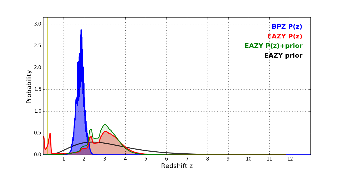 In P(z) plots: Yellow lines mark the cluster redshift z = 0.228,