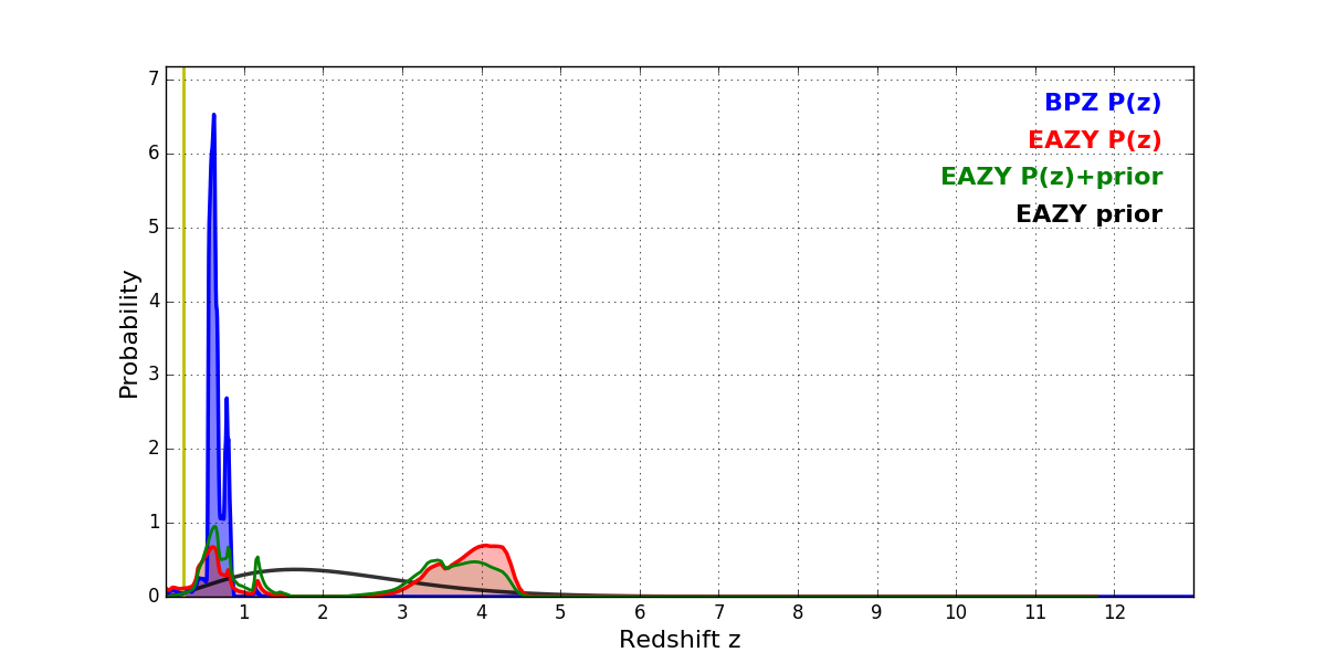 In P(z) plots: Yellow lines mark the cluster redshift z = 0.228,
