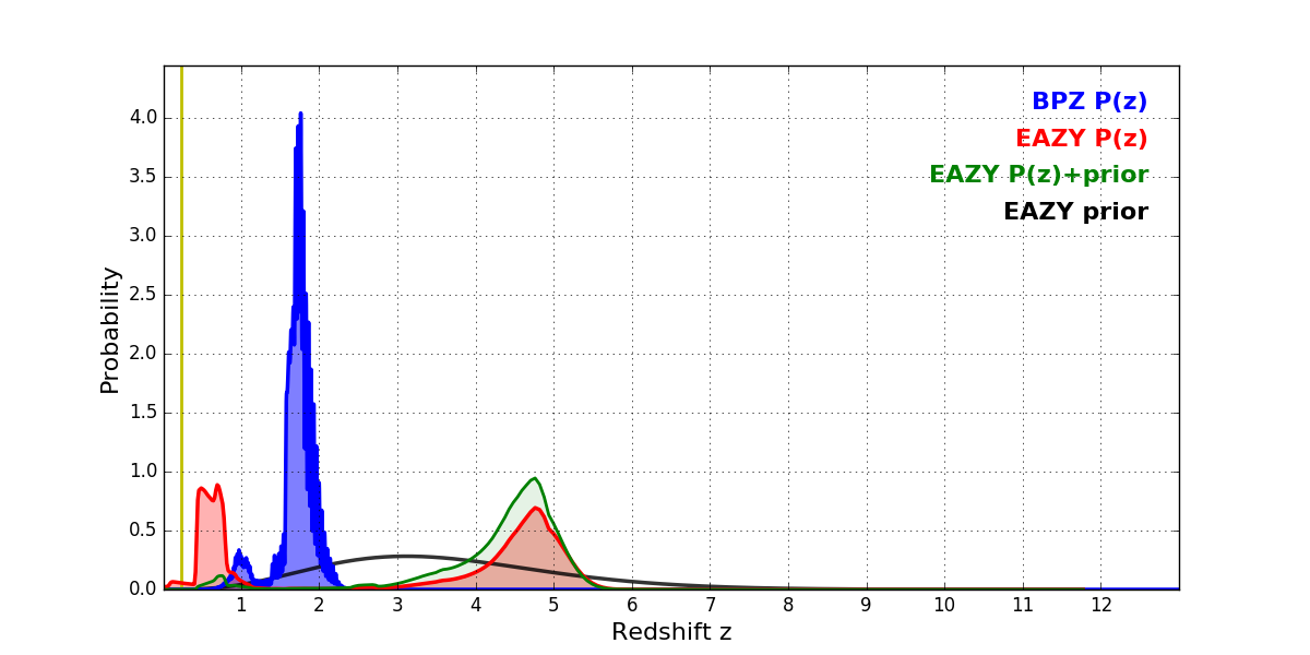 In P(z) plots: Yellow lines mark the cluster redshift z = 0.228,