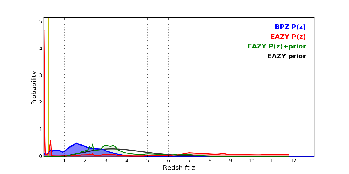 In P(z) plots: Yellow lines mark the cluster redshift z = 0.228,