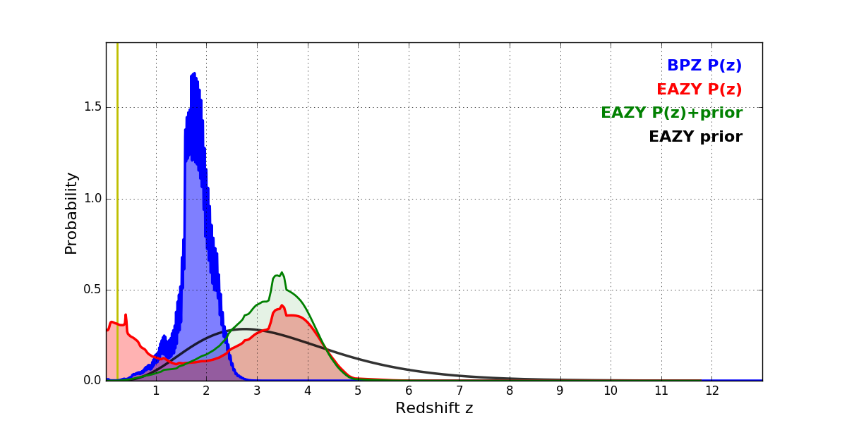 In P(z) plots: Yellow lines mark the cluster redshift z = 0.228,