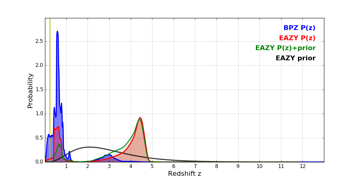 In P(z) plots: Yellow lines mark the cluster redshift z = 0.228,