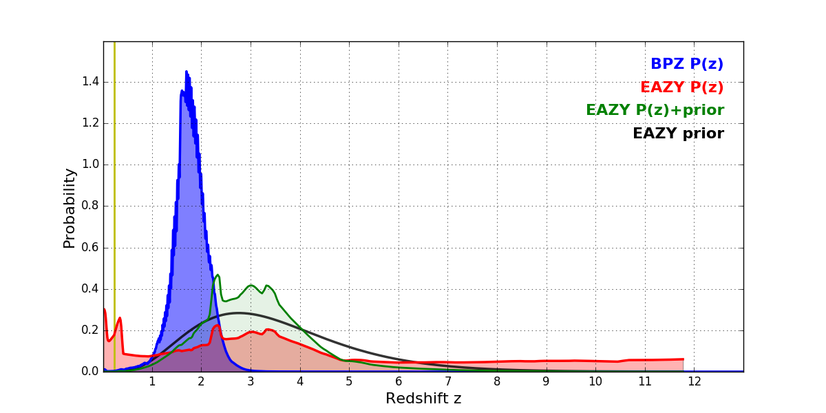 In P(z) plots: Yellow lines mark the cluster redshift z = 0.228,