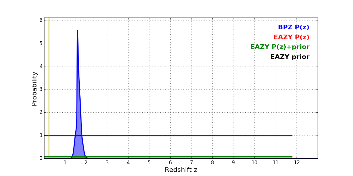 In P(z) plots: Yellow lines mark the cluster redshift z = 0.228,