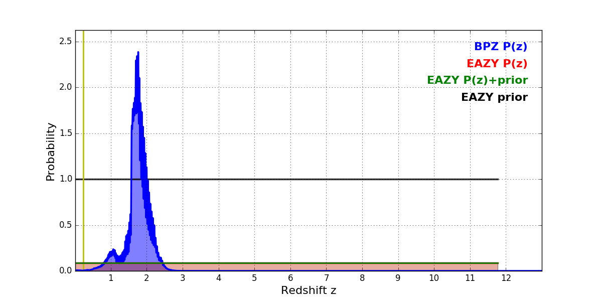 In P(z) plots: Yellow lines mark the cluster redshift z = 0.228,
