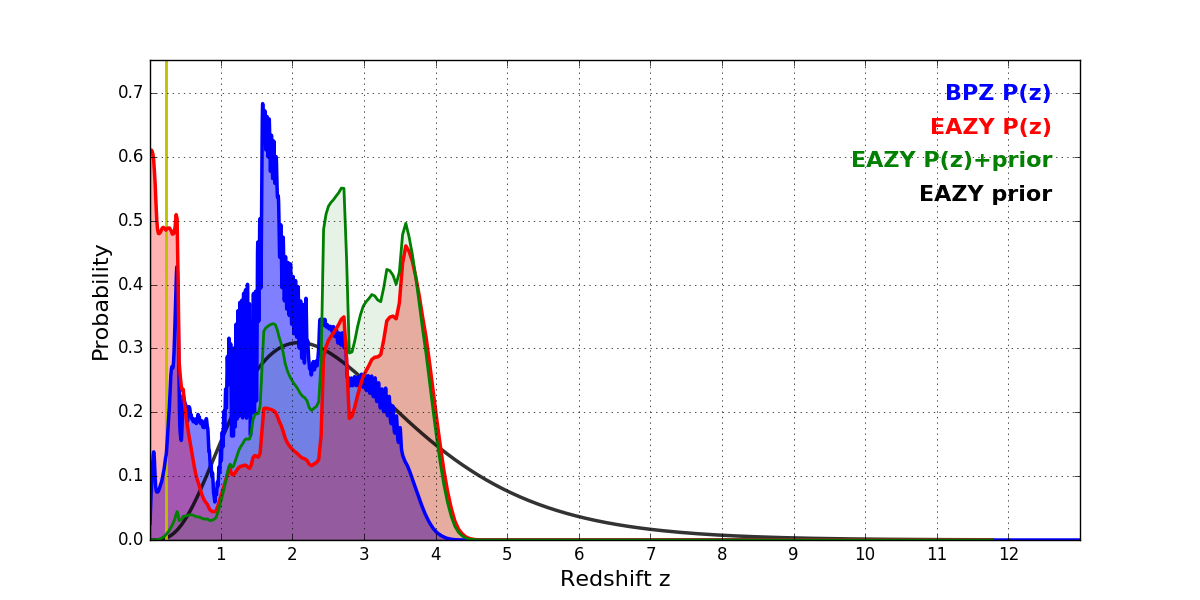 In P(z) plots: Yellow lines mark the cluster redshift z = 0.228,