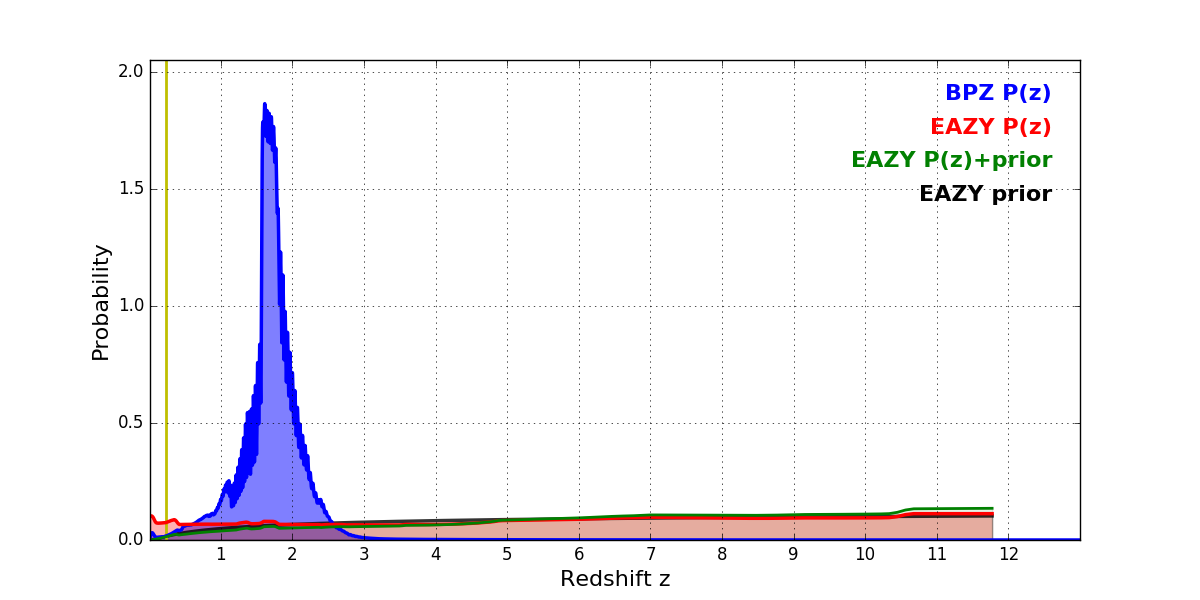 In P(z) plots: Yellow lines mark the cluster redshift z = 0.228,