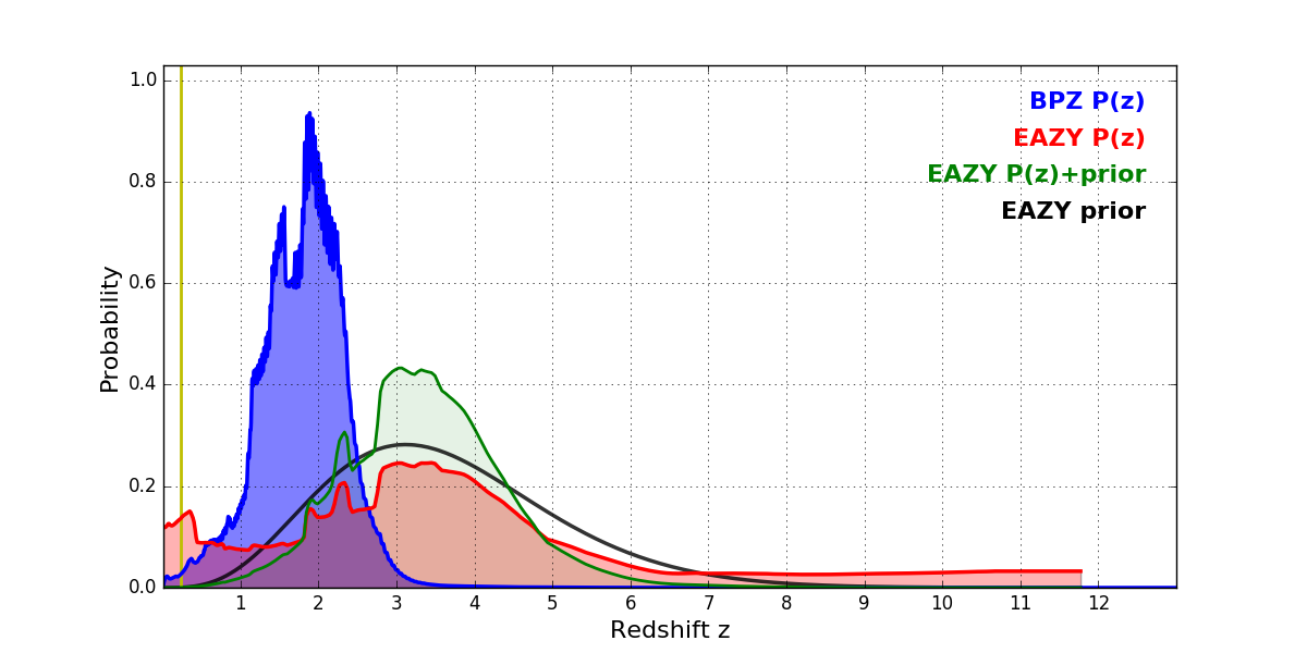 In P(z) plots: Yellow lines mark the cluster redshift z = 0.228,