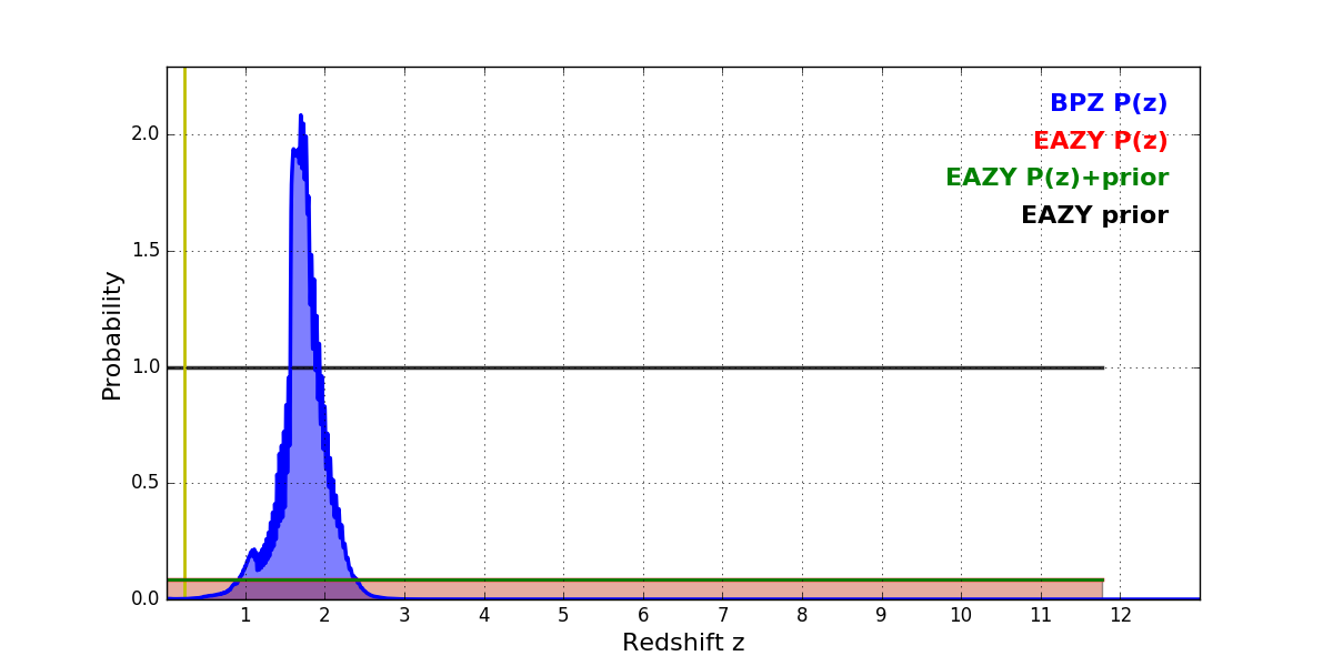 In P(z) plots: Yellow lines mark the cluster redshift z = 0.228,