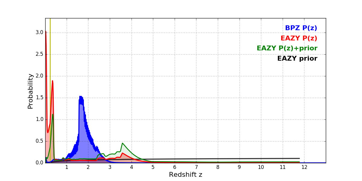 In P(z) plots: Yellow lines mark the cluster redshift z = 0.228,