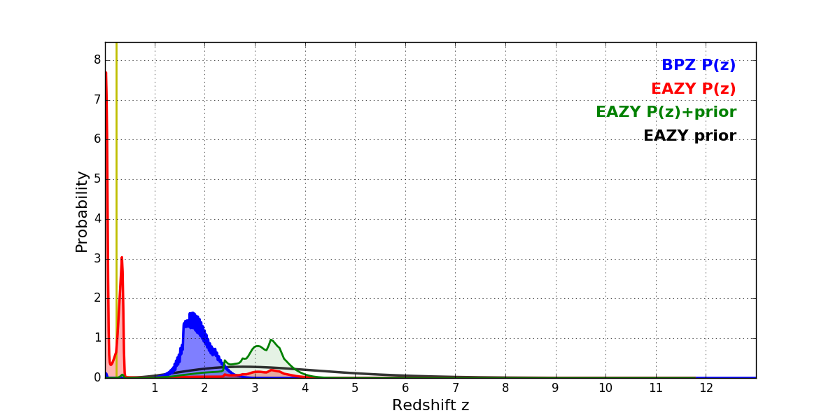 In P(z) plots: Yellow lines mark the cluster redshift z = 0.228,