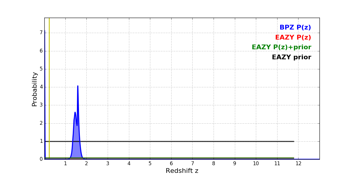 In P(z) plots: Yellow lines mark the cluster redshift z = 0.228,