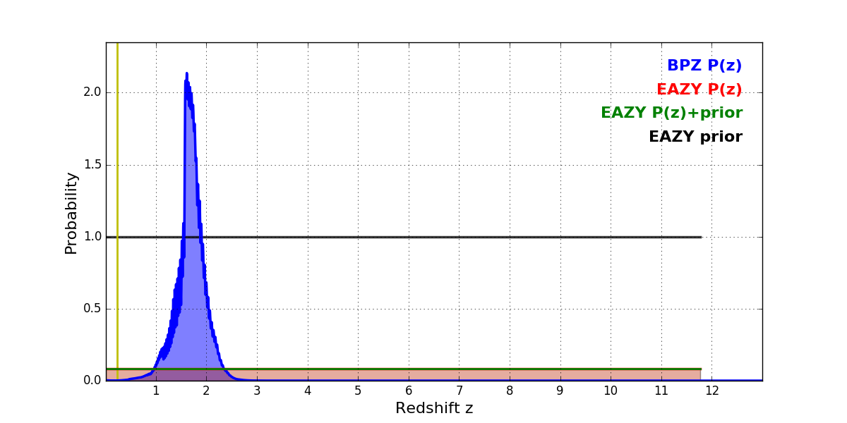In P(z) plots: Yellow lines mark the cluster redshift z = 0.228,