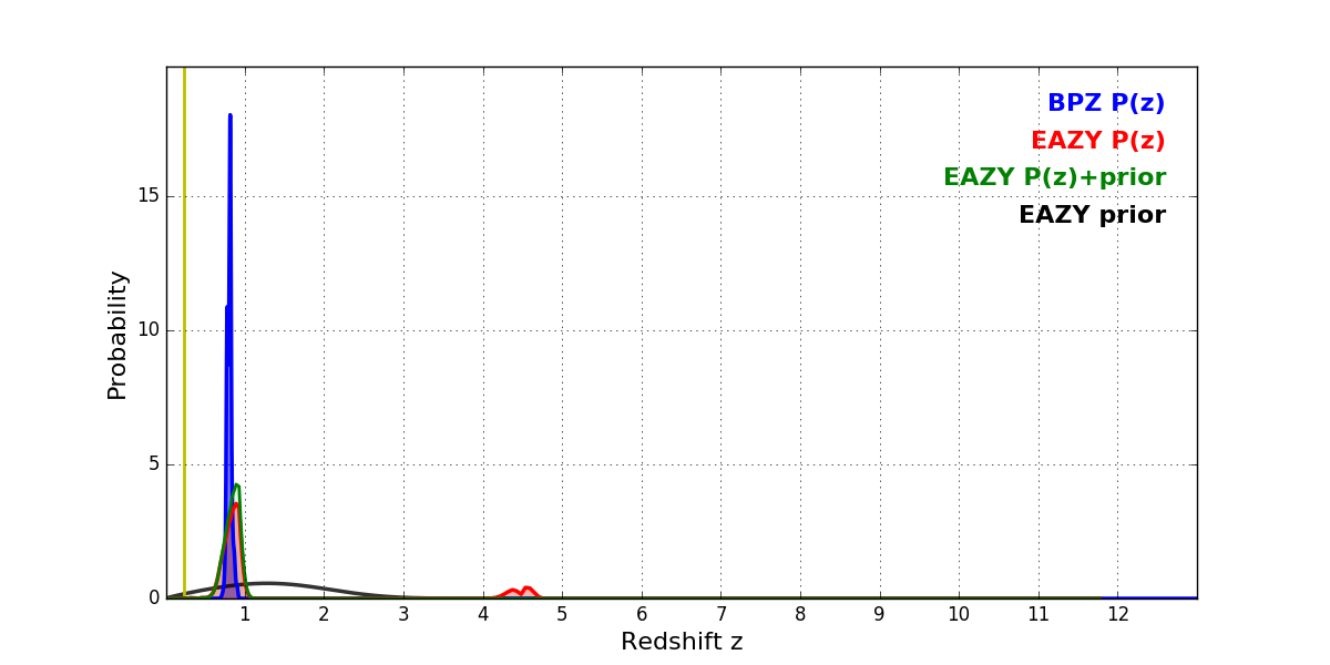 In P(z) plots: Yellow lines mark the cluster redshift z = 0.228,