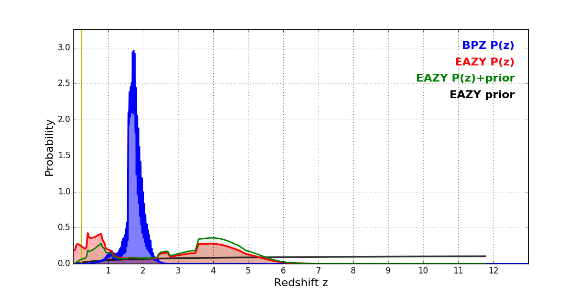 In P(z) plots: Yellow lines mark the cluster redshift z = 0.228,