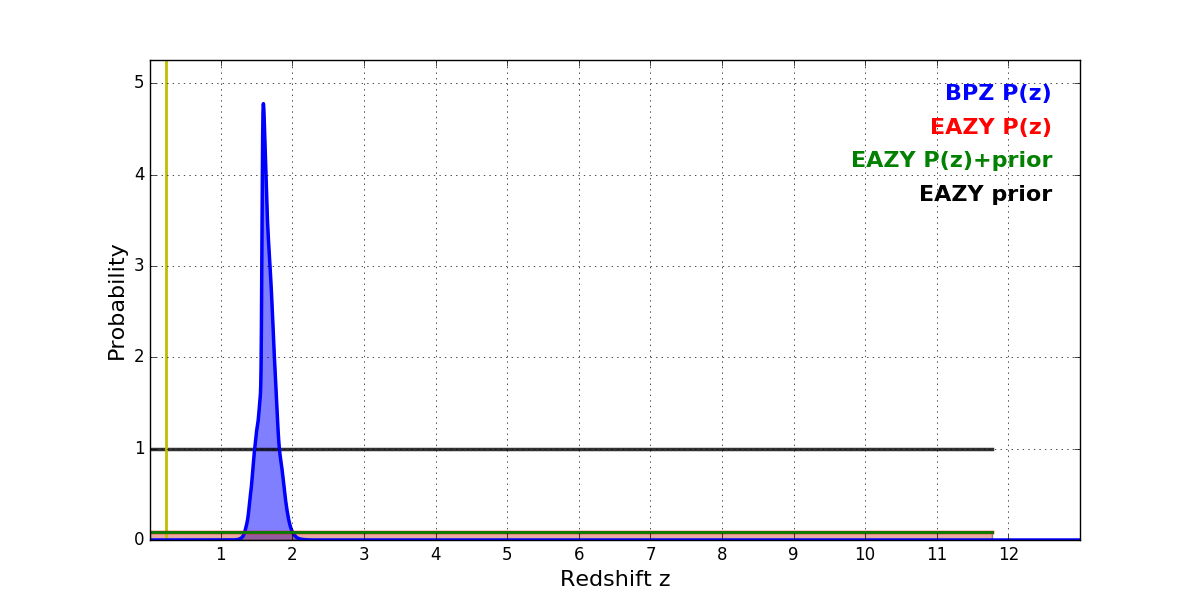 In P(z) plots: Yellow lines mark the cluster redshift z = 0.228,