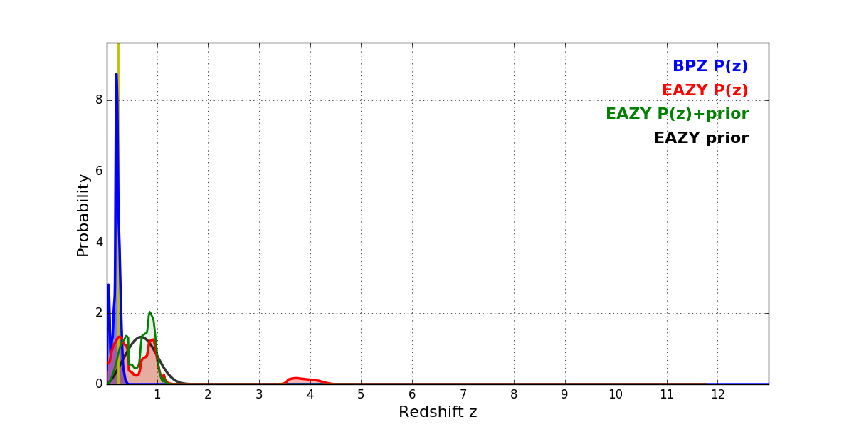 In P(z) plots: Yellow lines mark the cluster redshift z = 0.228,