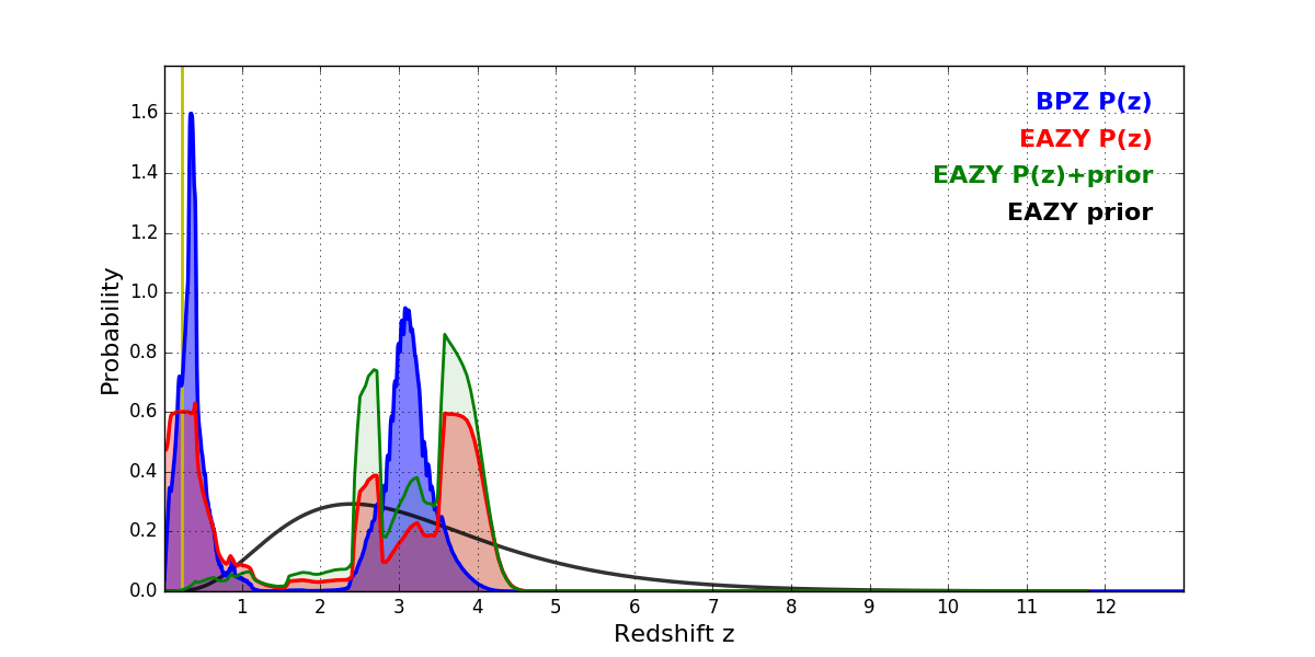 In P(z) plots: Yellow lines mark the cluster redshift z = 0.228,