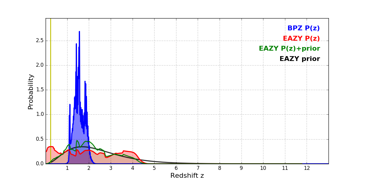 In P(z) plots: Yellow lines mark the cluster redshift z = 0.228,