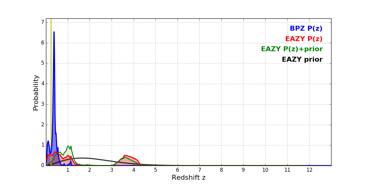 In P(z) plots: Yellow lines mark the cluster redshift z = 0.228,