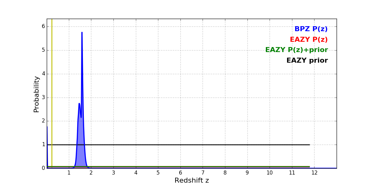 In P(z) plots: Yellow lines mark the cluster redshift z = 0.228,