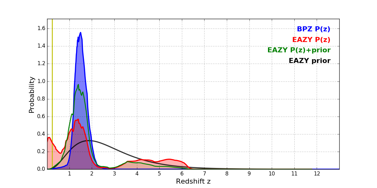 In P(z) plots: Yellow lines mark the cluster redshift z = 0.228,