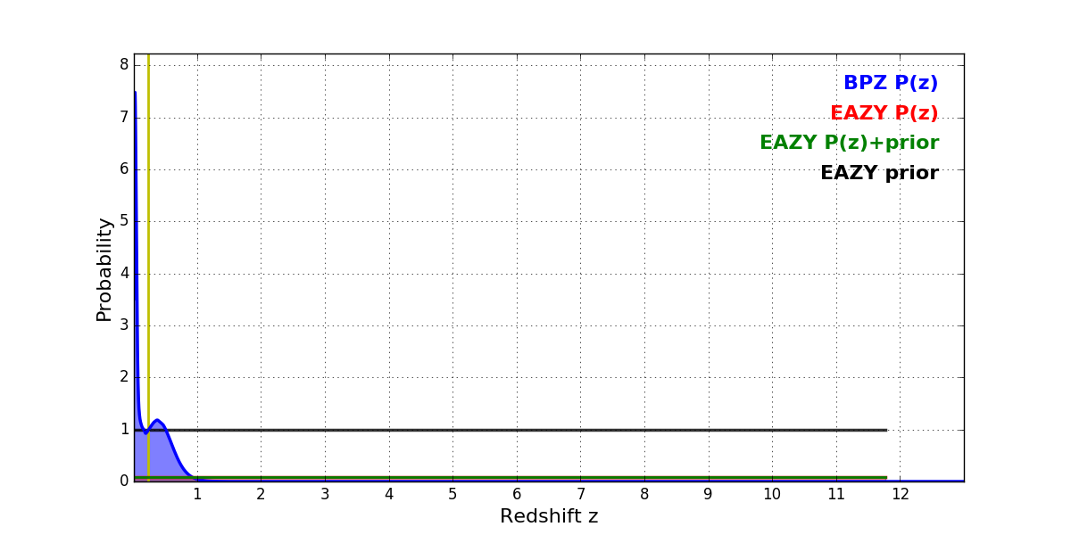 In P(z) plots: Yellow lines mark the cluster redshift z = 0.228,