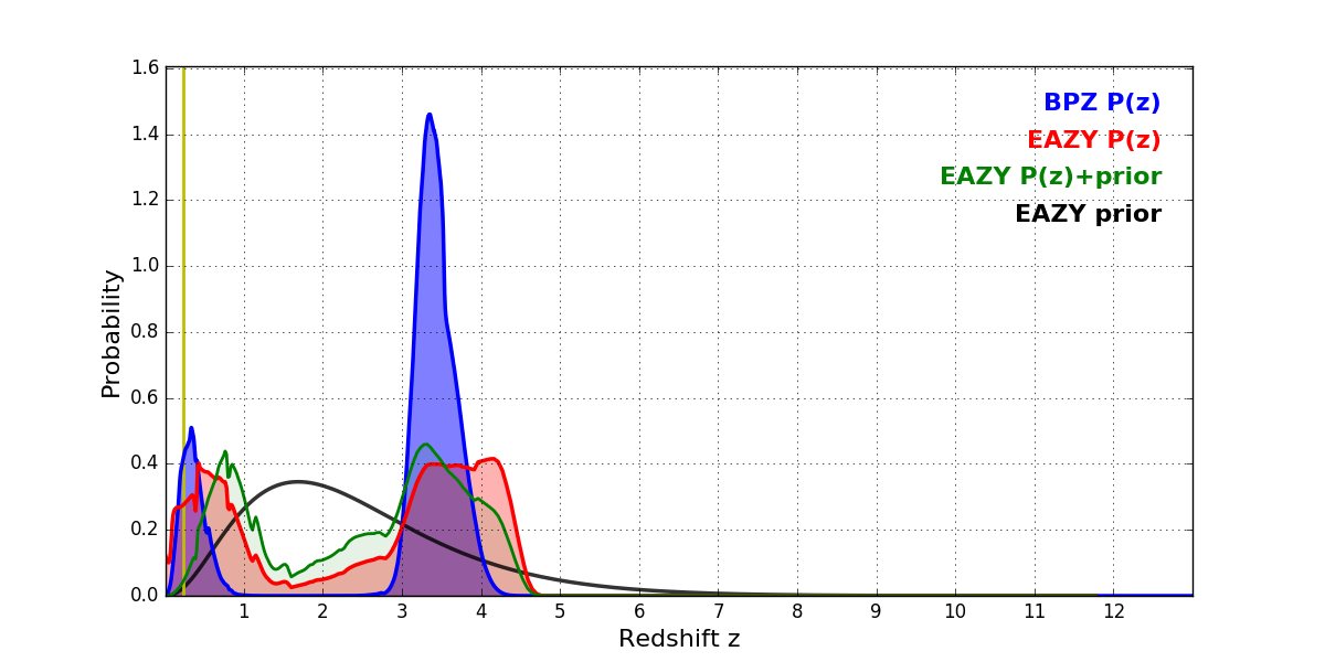 In P(z) plots: Yellow lines mark the cluster redshift z = 0.228,