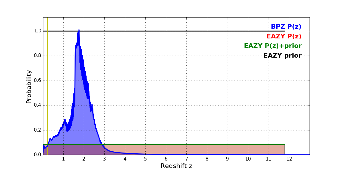 In P(z) plots: Yellow lines mark the cluster redshift z = 0.228,