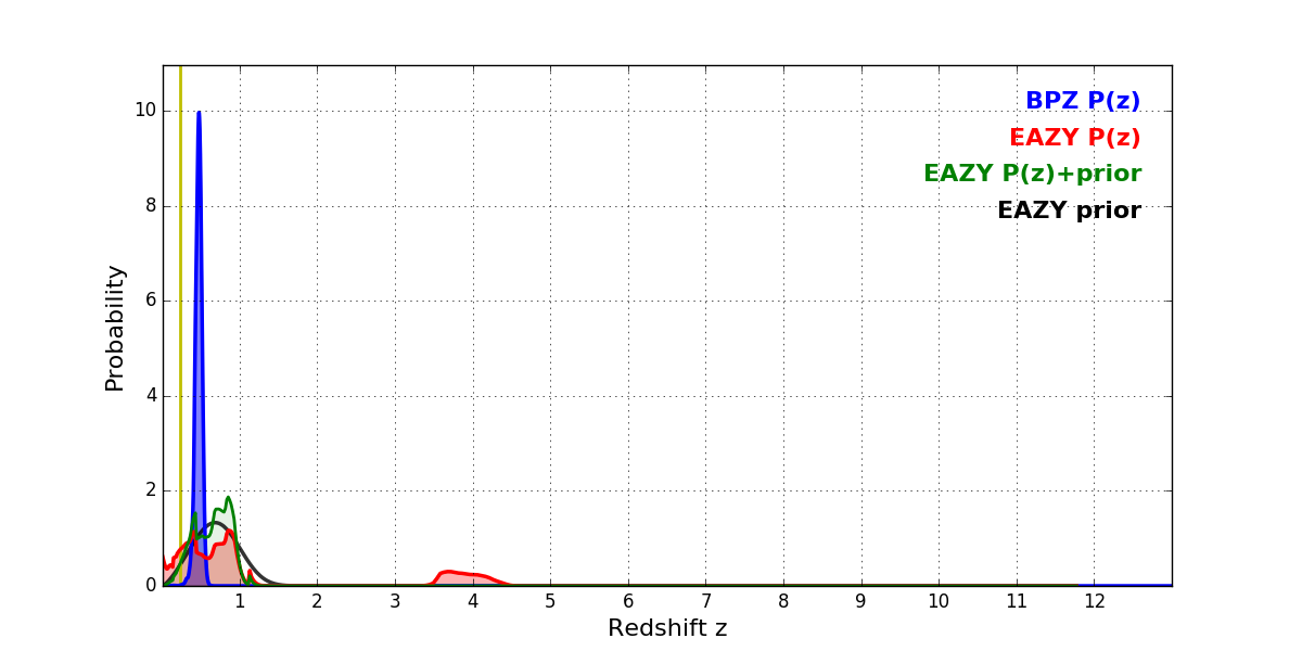 In P(z) plots: Yellow lines mark the cluster redshift z = 0.228,