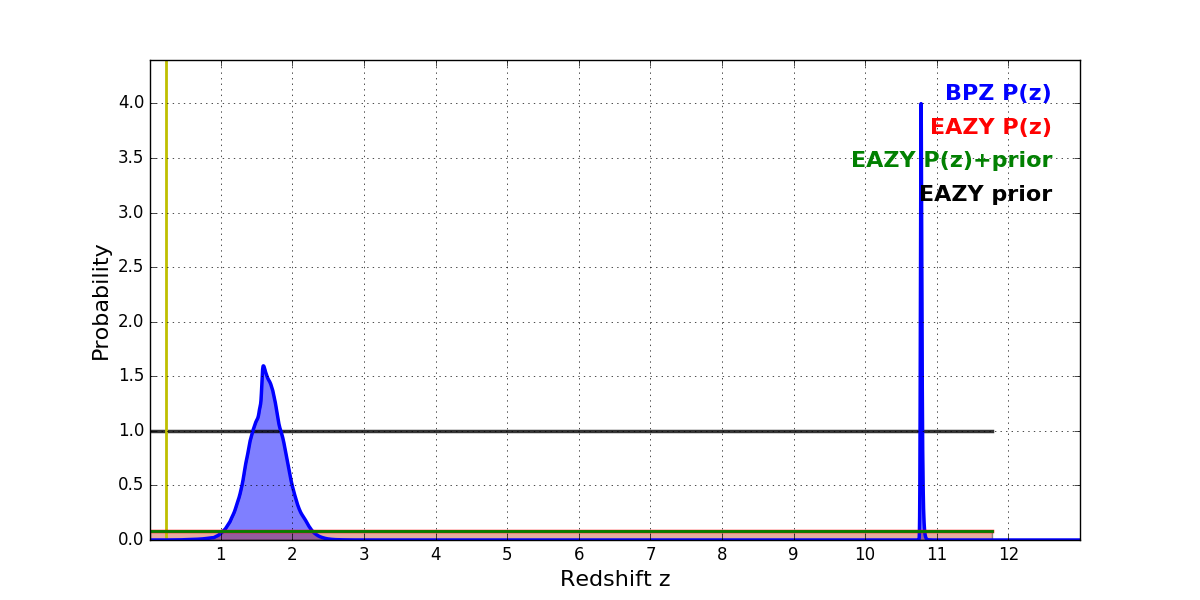 In P(z) plots: Yellow lines mark the cluster redshift z = 0.228,