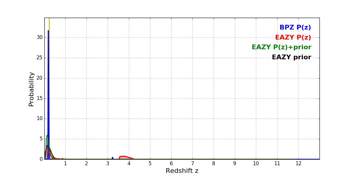 In P(z) plots: Yellow lines mark the cluster redshift z = 0.228,