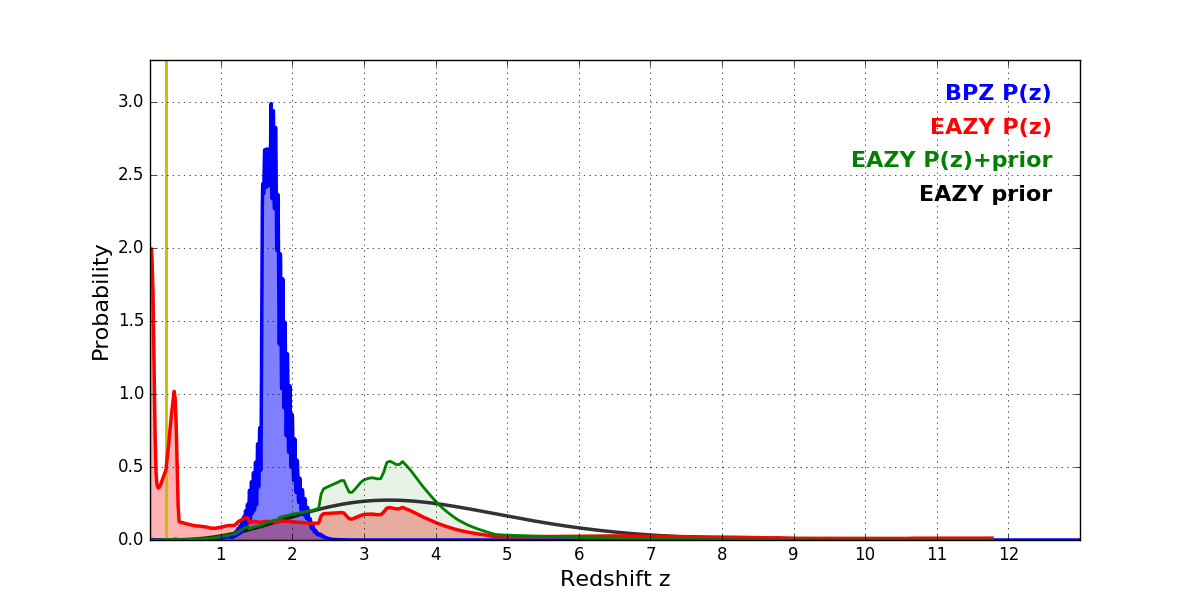 In P(z) plots: Yellow lines mark the cluster redshift z = 0.228,