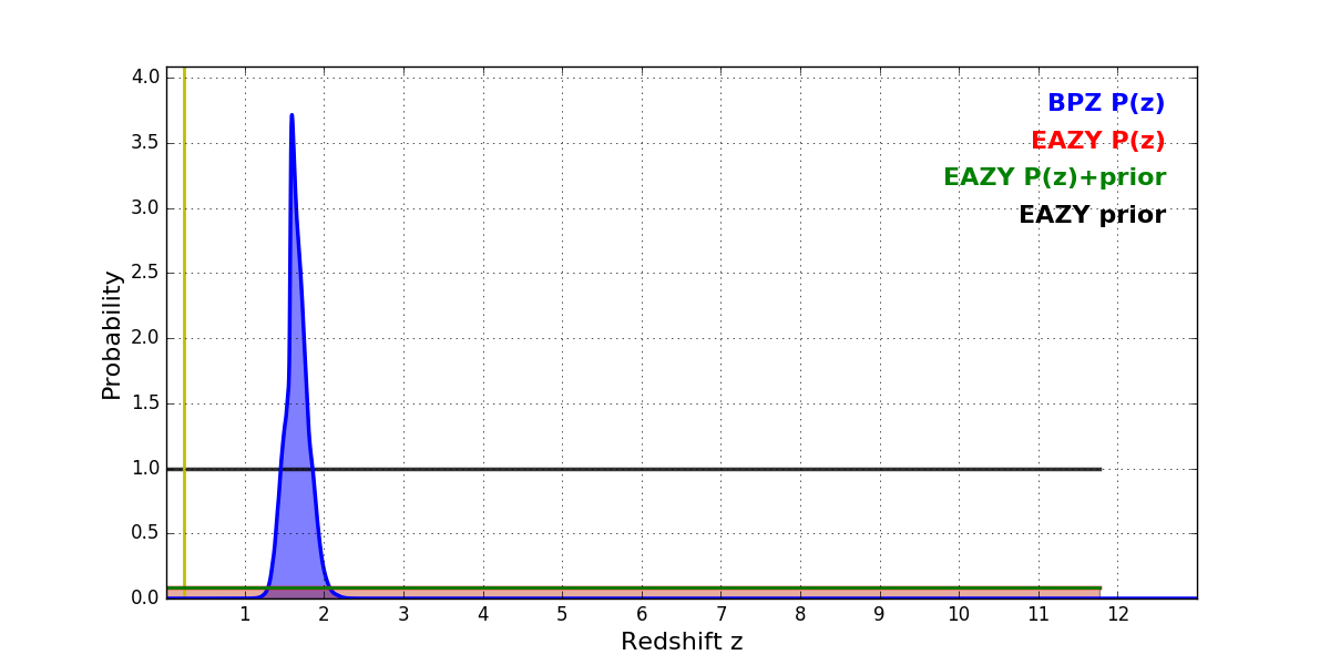 In P(z) plots: Yellow lines mark the cluster redshift z = 0.228,