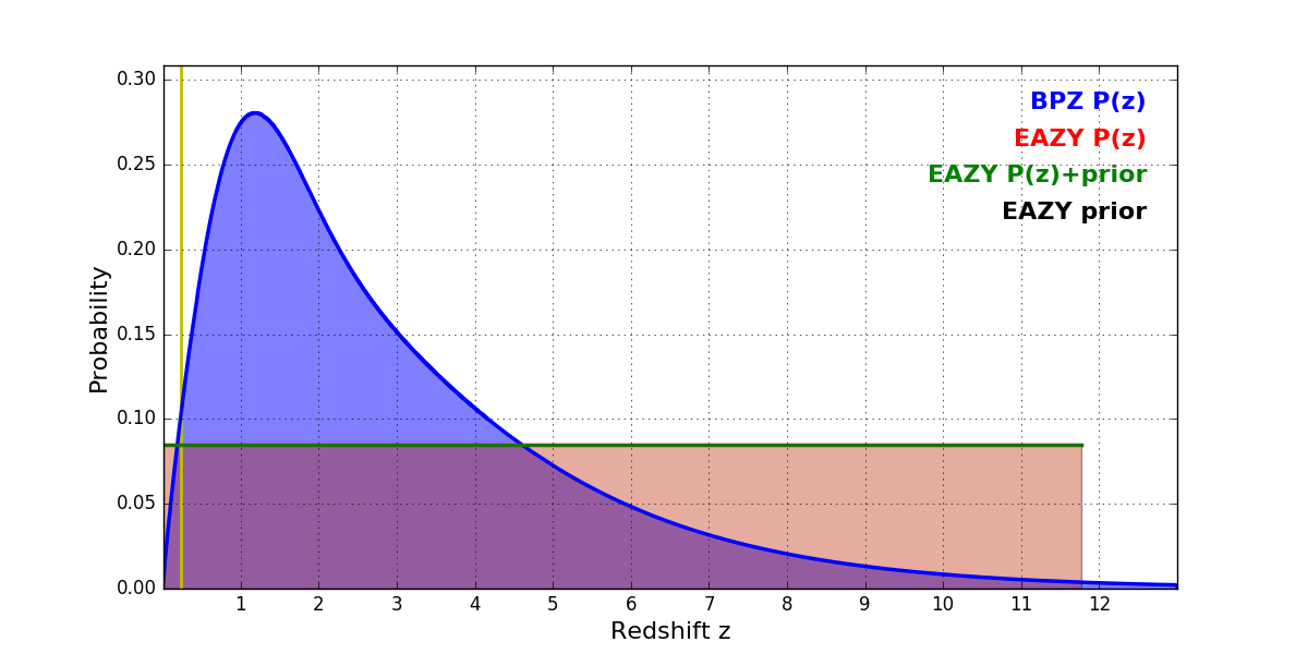 In P(z) plots: Yellow lines mark the cluster redshift z = 0.228,
