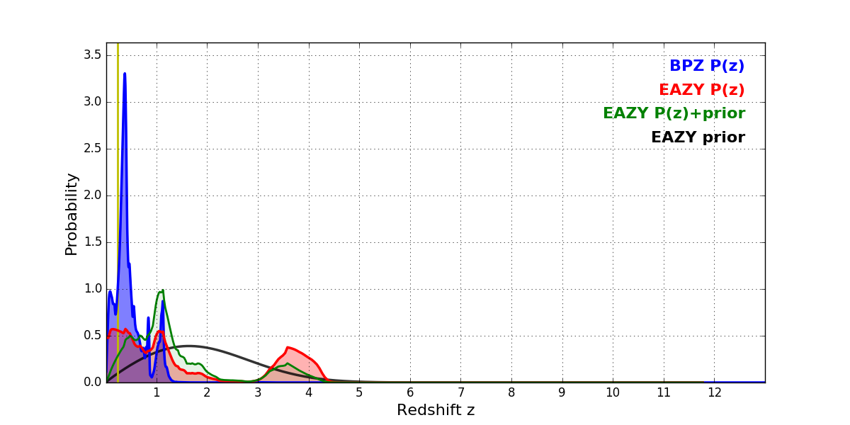 In P(z) plots: Yellow lines mark the cluster redshift z = 0.228,