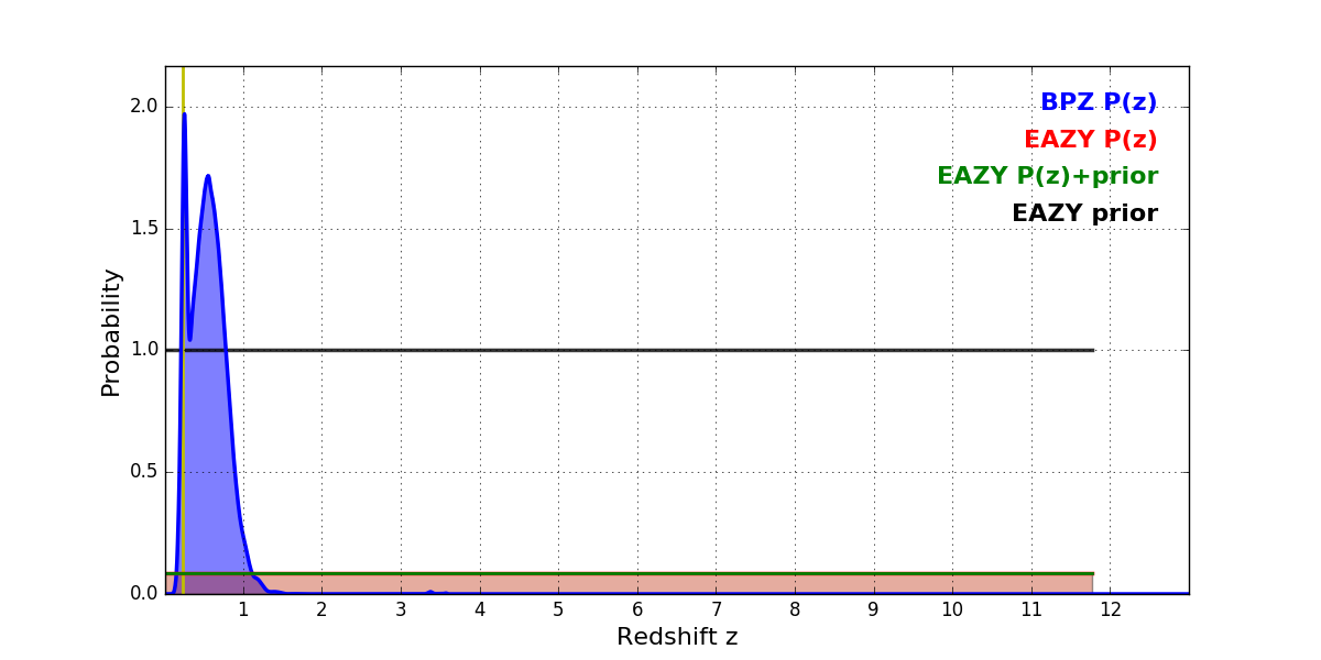 In P(z) plots: Yellow lines mark the cluster redshift z = 0.228,