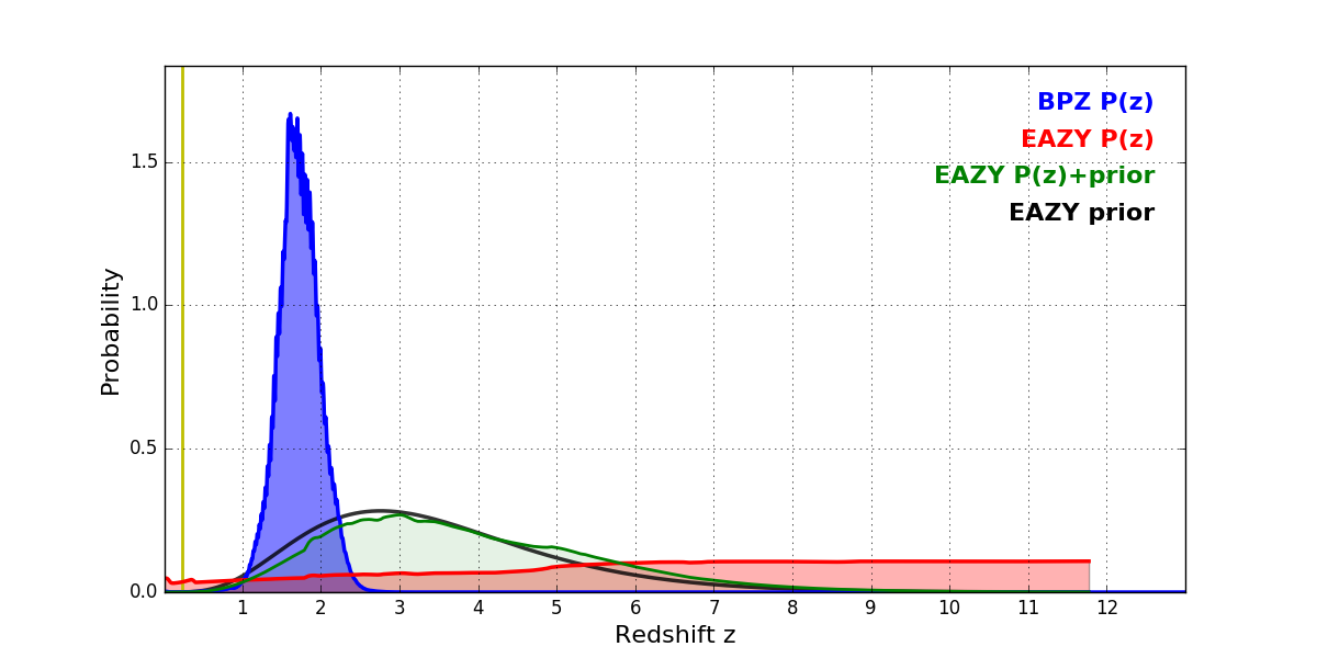 In P(z) plots: Yellow lines mark the cluster redshift z = 0.228,