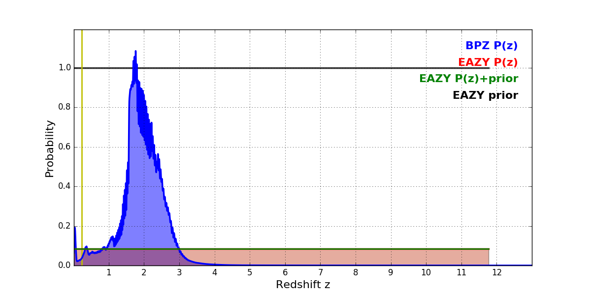 In P(z) plots: Yellow lines mark the cluster redshift z = 0.228,
