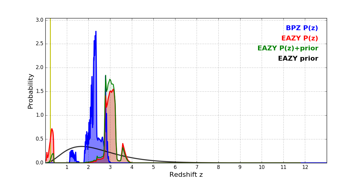 In P(z) plots: Yellow lines mark the cluster redshift z = 0.228,