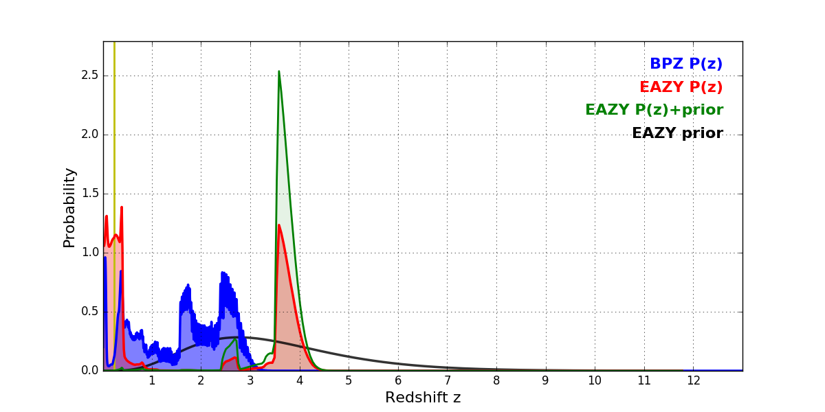 In P(z) plots: Yellow lines mark the cluster redshift z = 0.228,