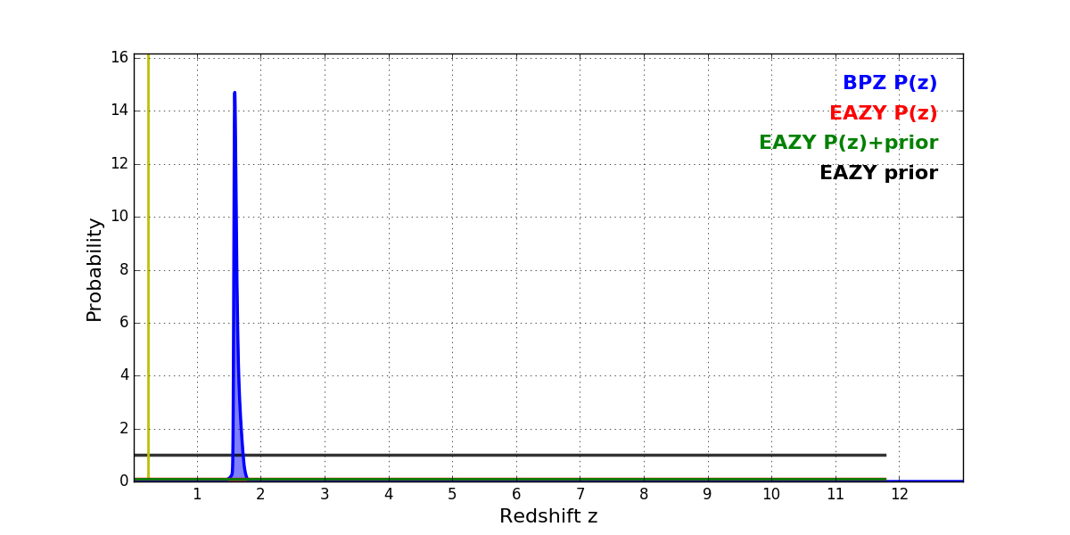 In P(z) plots: Yellow lines mark the cluster redshift z = 0.228,