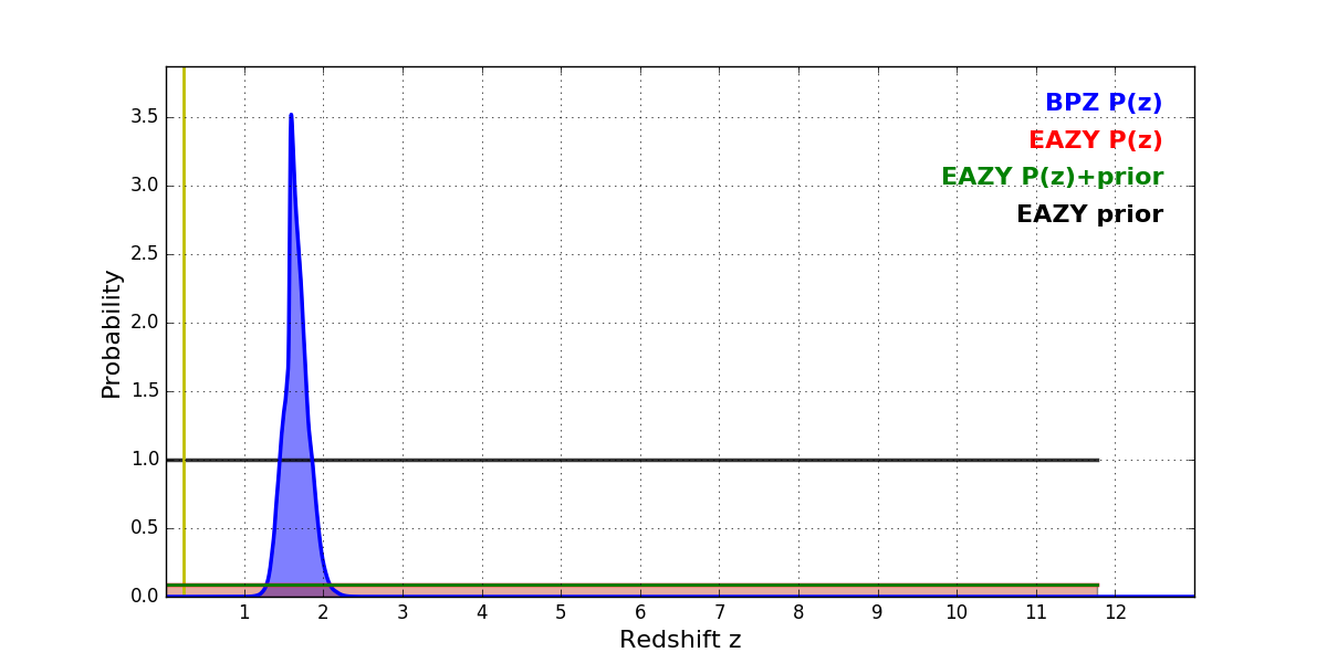 In P(z) plots: Yellow lines mark the cluster redshift z = 0.228,
