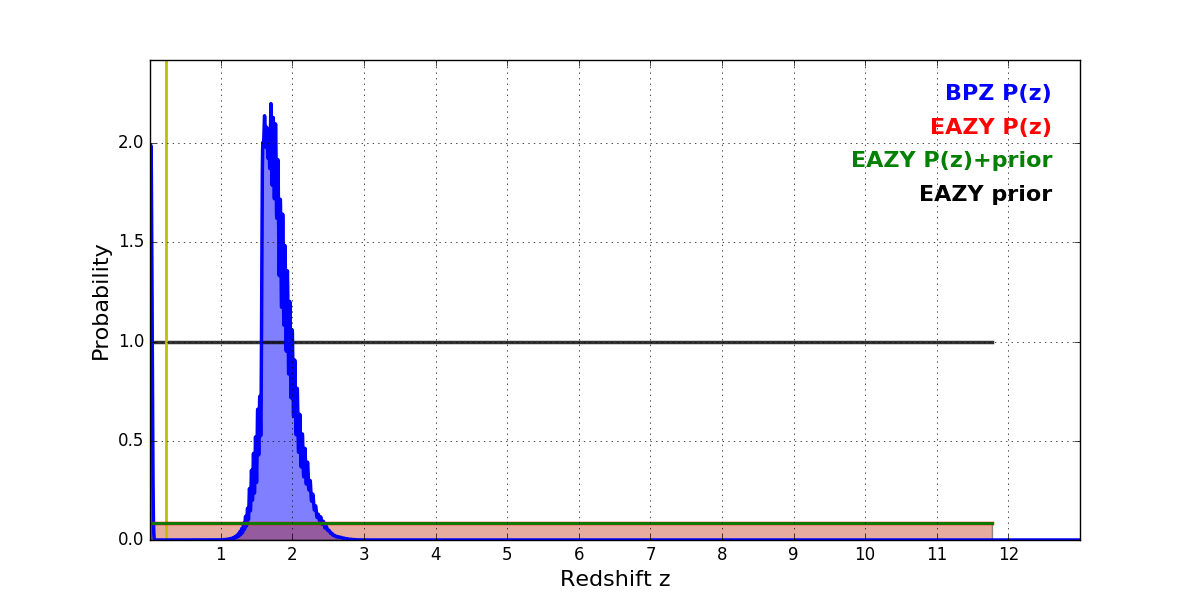 In P(z) plots: Yellow lines mark the cluster redshift z = 0.228,