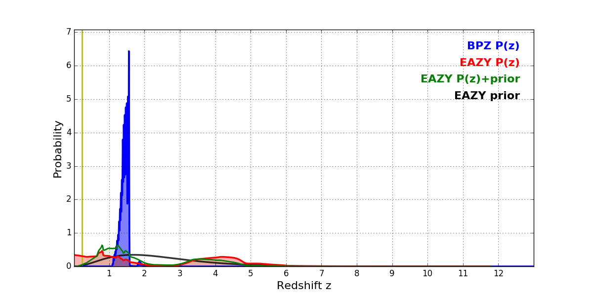 In P(z) plots: Yellow lines mark the cluster redshift z = 0.228,