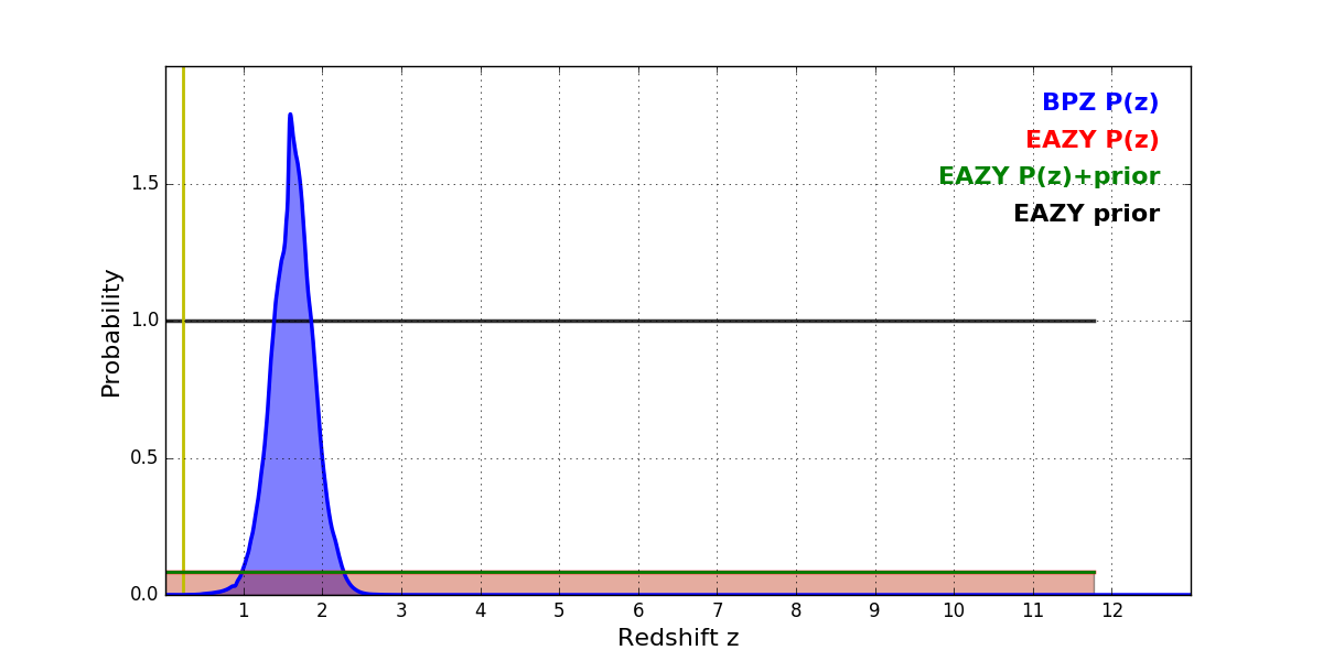 In P(z) plots: Yellow lines mark the cluster redshift z = 0.228,