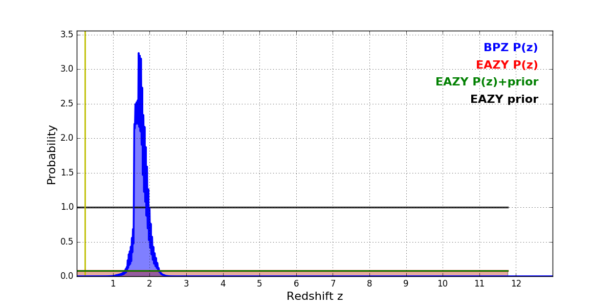 In P(z) plots: Yellow lines mark the cluster redshift z = 0.228,