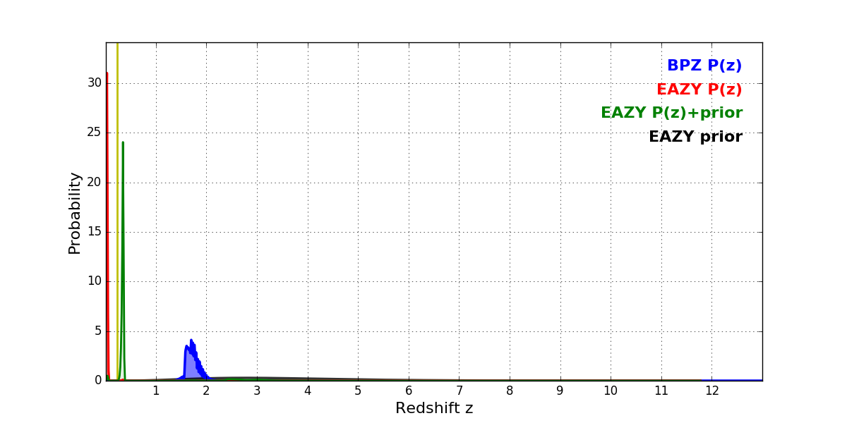 In P(z) plots: Yellow lines mark the cluster redshift z = 0.228,
